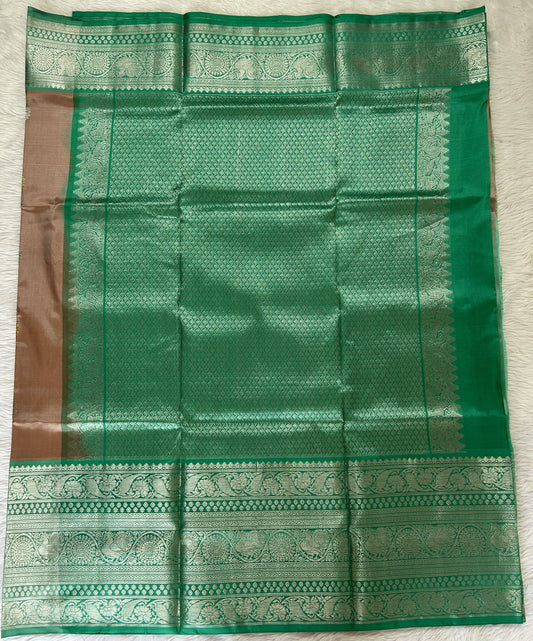 Venkatagiri Pattu Saree Beige Colored Complemented With a Pattu Sea Green Silver Kanchi Border