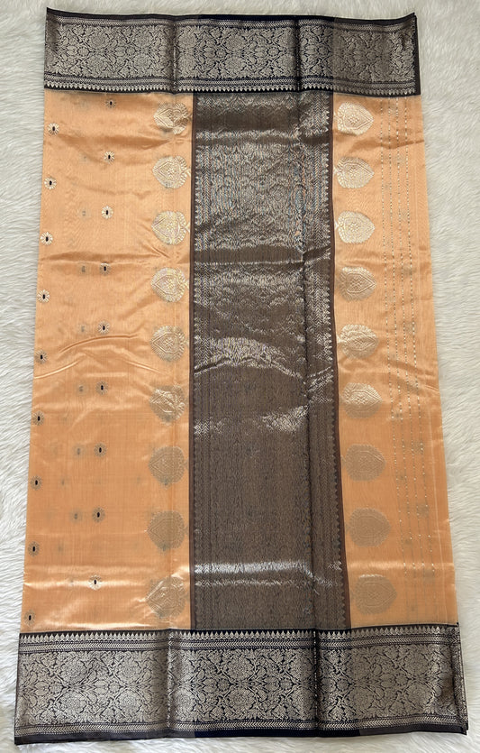 Chanderi Silk Saree Pastel Orange colored Complemented with a Dark Grey Color Kanchi Border