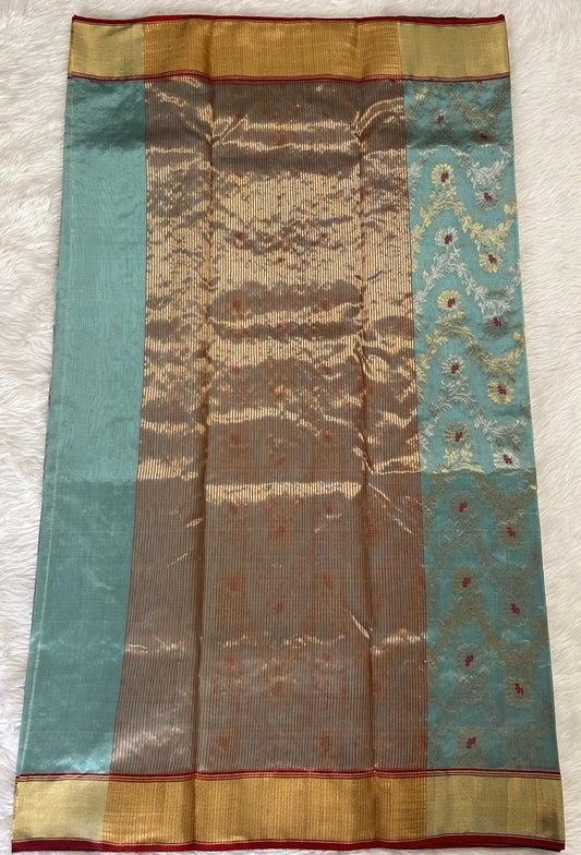Chanderi Pattu Saree Turquoise Blue colored saree complemented with a Red Color Gold Zari Weaving border
