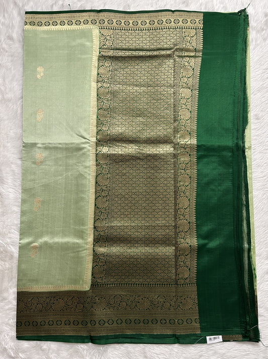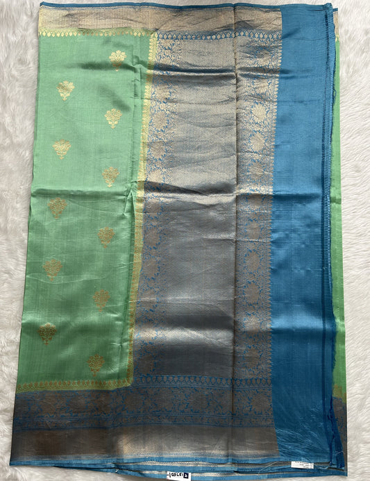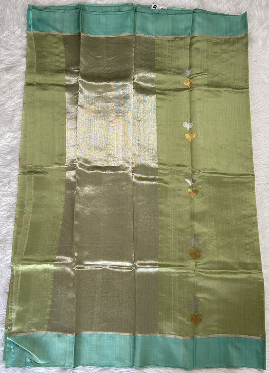 Raw Mango or Pooniya Silk Saree Mint Green Colored Complemented With a Turquoise blue Gold Zari Border