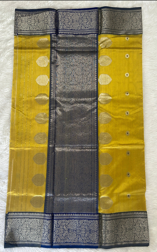 Chanderi Pattu Saree Mustard Yellow colored saree complemented with Teal Blue Color Kanchi border