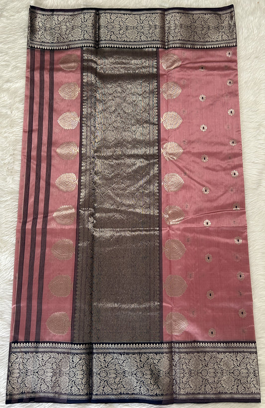 Chanderi Pattu Saree Macaroon colored saree complemented with a Elephant Grey Color Kanchi border