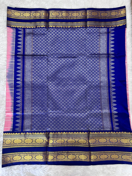 Venkatagiri Pattu Saree Baby Pink Colored Complemented With a Ink Blue Color Kanchi Border