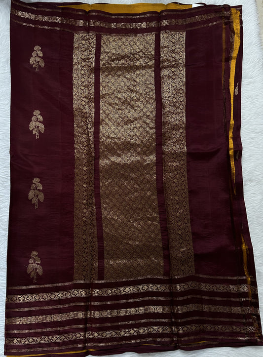 Dola Crepe Saree Brown Colored Complemented with a Zari Border.