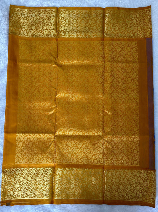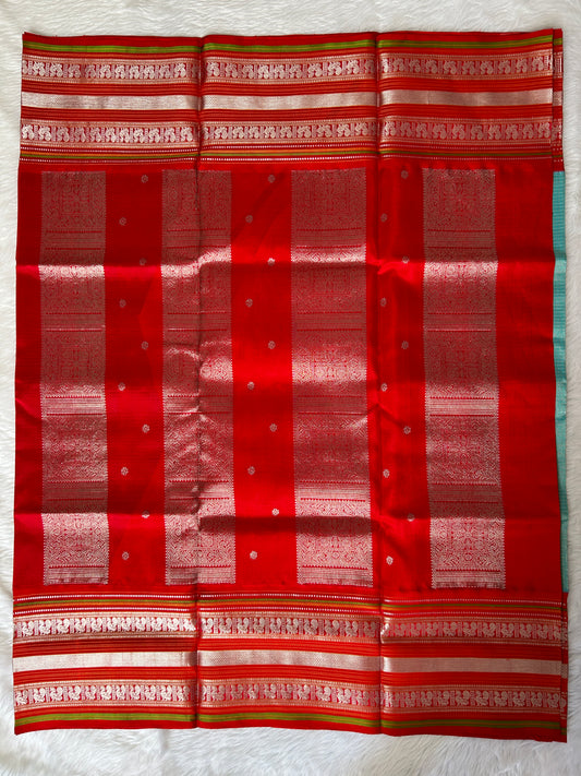 Venkatagiri Pattu Saree Citrus Colored Complemented With a Pattu Teal Blue and Flame Yellow Color with Silver Zari Gap Border