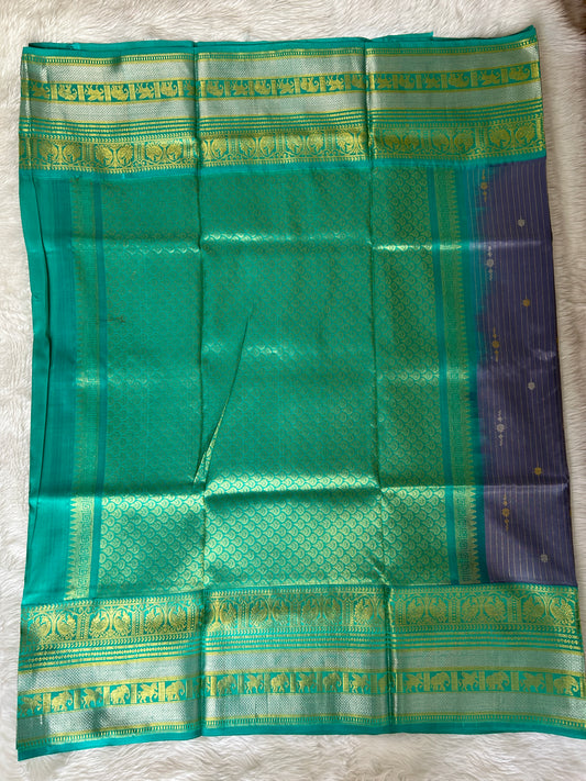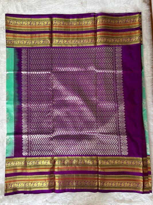 Venkatagiri Pattu Saree Aqua Blue Colored Complemented With a Purple Color Kanchi and Kuttu Border