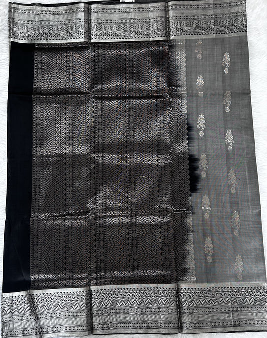 Venkatagiri Pattu Saree Fuscous Grey Colored Complemented With a Pattu Black and Silver Zari Weaving Border