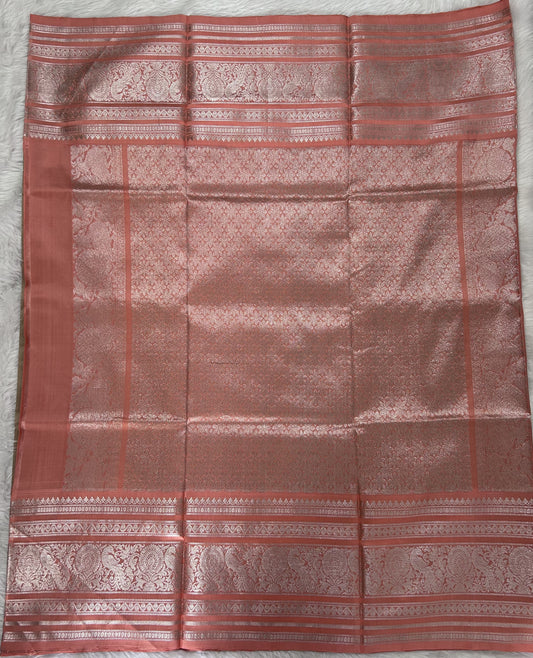 Venkatagiri Pattu Saree Dust Colored Complemented With a Coral Color Silver Zari Border