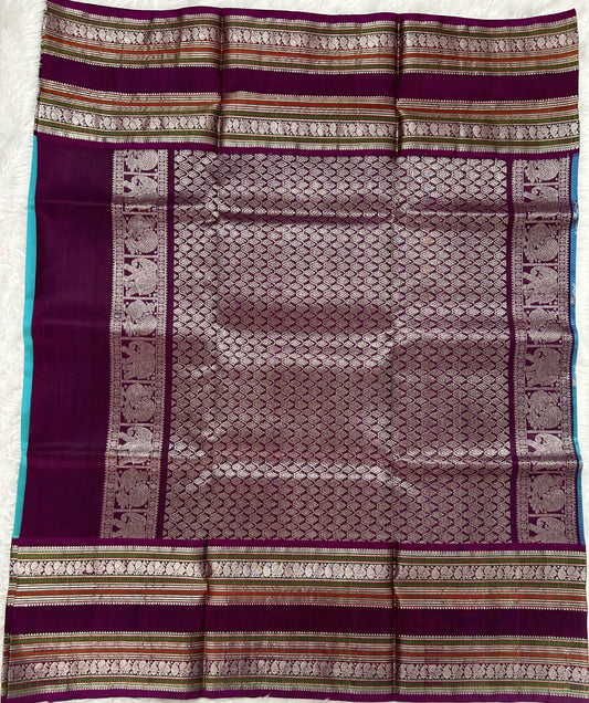 Venkatagiri Pattu Saree Turquoise Blue Colored Complemented With a magenta purple Color Kanchi Silver Zari Border