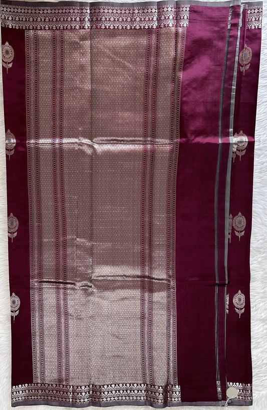 Raw Mango or Pooniya Silk Saree Burgundy Colored Complemented With a Silver Zari Border