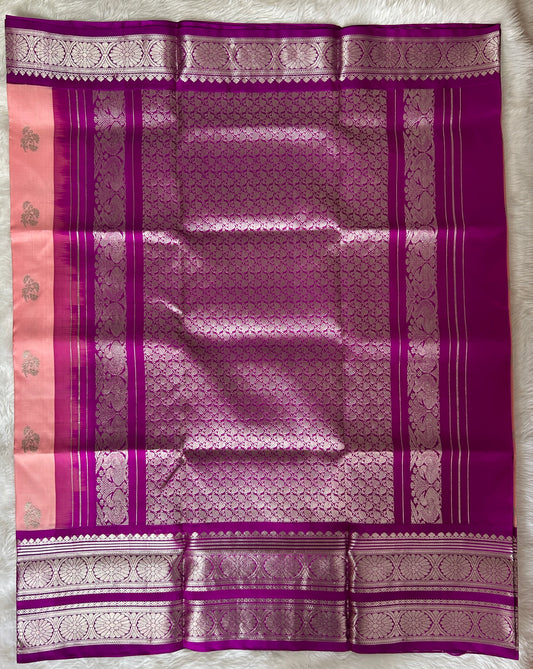 Venkatagiri Pattu Saree Blushing Peach Colored Complemented With a Purple Color Kuttu Border