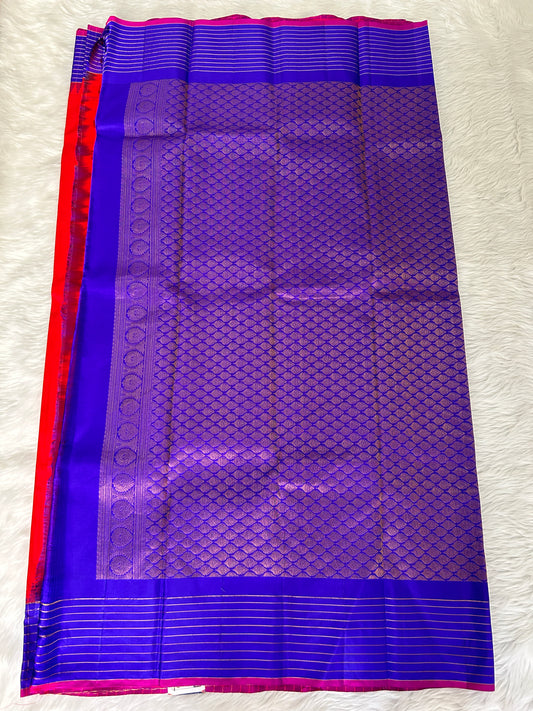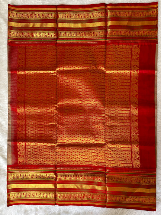 Gadwal Pattu Saree Blood Red-colored saree complemented with a Navy Blue border