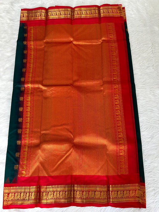 Gadwal Pattu Saree Bottle Green-colored saree complemented with a Red border