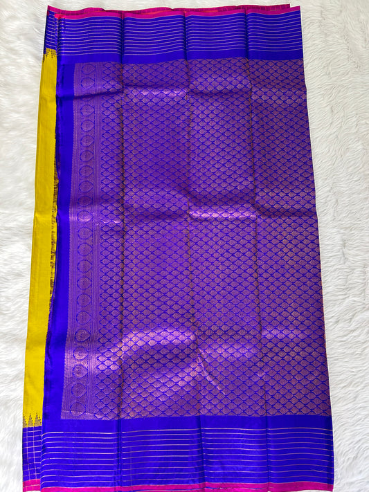 Gadwal Pattu Saree Lemon Yellow colored saree complemented with a Royal Blue border