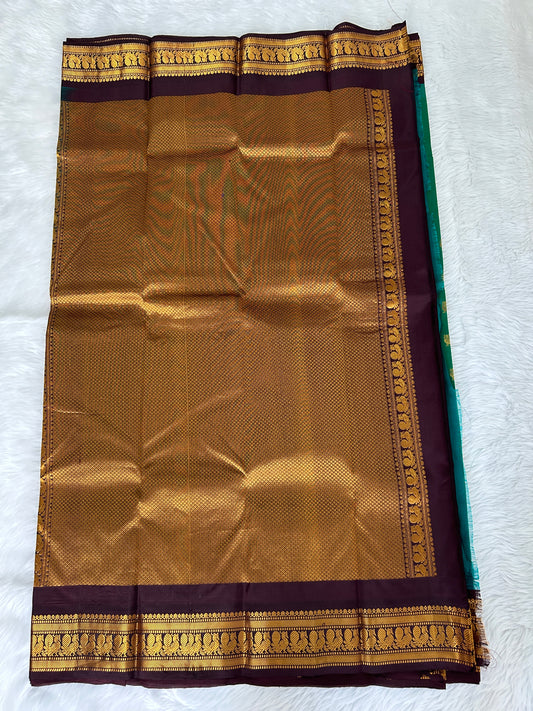Gadwal Pattu Saree Bottle Green colored saree complemented with a Brown Kanchi border