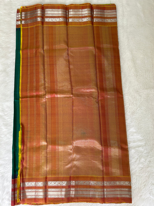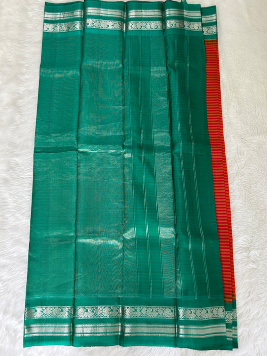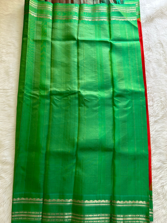 Gadwal Pattu Saree Green Colored Complemented With a Light Orange Gap Border