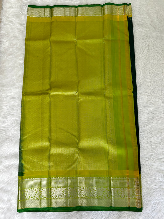 Gadwal Pattu Saree Bottle Green-colored saree complemented with a Lemon Yellow border