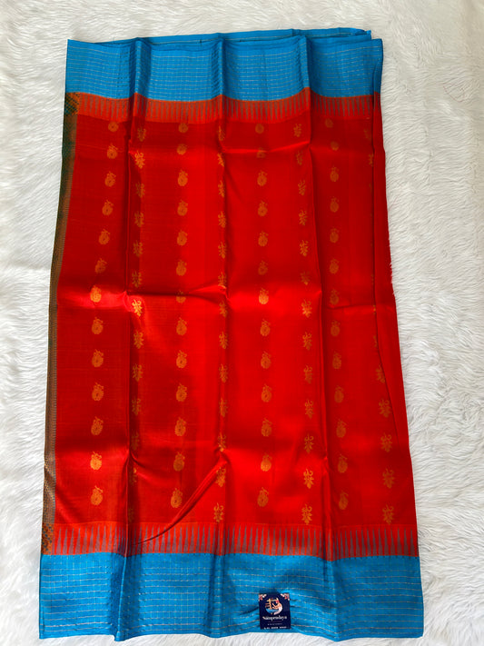 Gadwal Pattu Saree Tomato Red-colored saree complemented with a Teal Blue border
