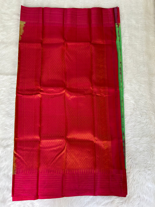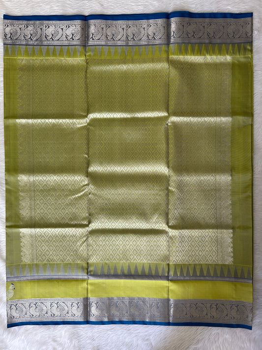 Venkatagiri Pattu Saree Parrot Green Colored Complemented With a Teal Blue Color Border