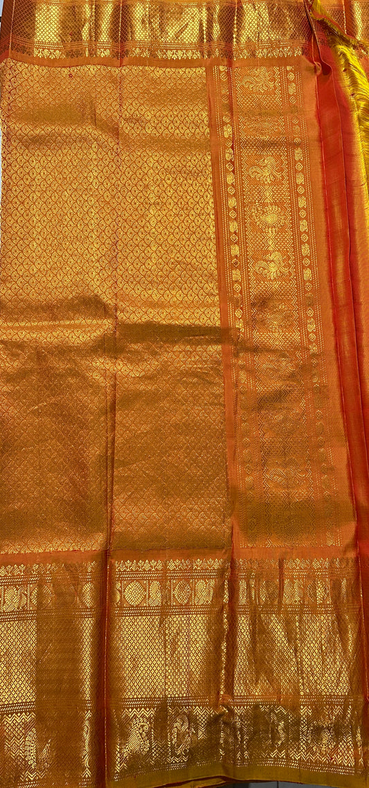 Gadwal Pattu Saree Orange Colored Saree Complemented With a Green Gap Border