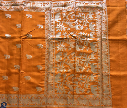 Pure Chiniya Silk Saree Orange Colored Elegantly Paired with a Silver Zari Border.