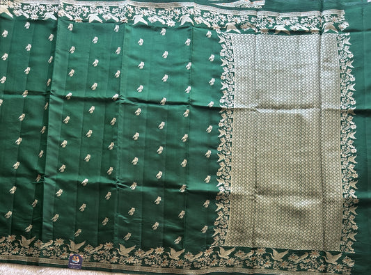 Pure Chiniya Silk Saree Dark Jungle Colored Elegantly Paired with a Gold Zari Border.