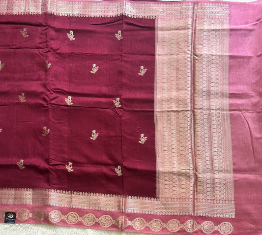 Pure Kanjivaram Silk Saree Dark Red Colored Elegantly Paid with a Gold Zari Border.
