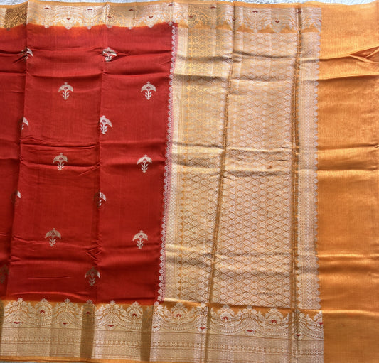 Banarasi Fancy Saree Rust Orange Colored Complemented with a Solver Zari Border.