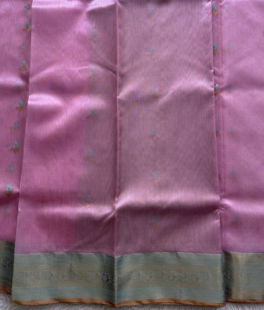 Baby Pink Chanderi Silk Saree With Gold Zari Border — Pure Handloom | Silk Mark Certified