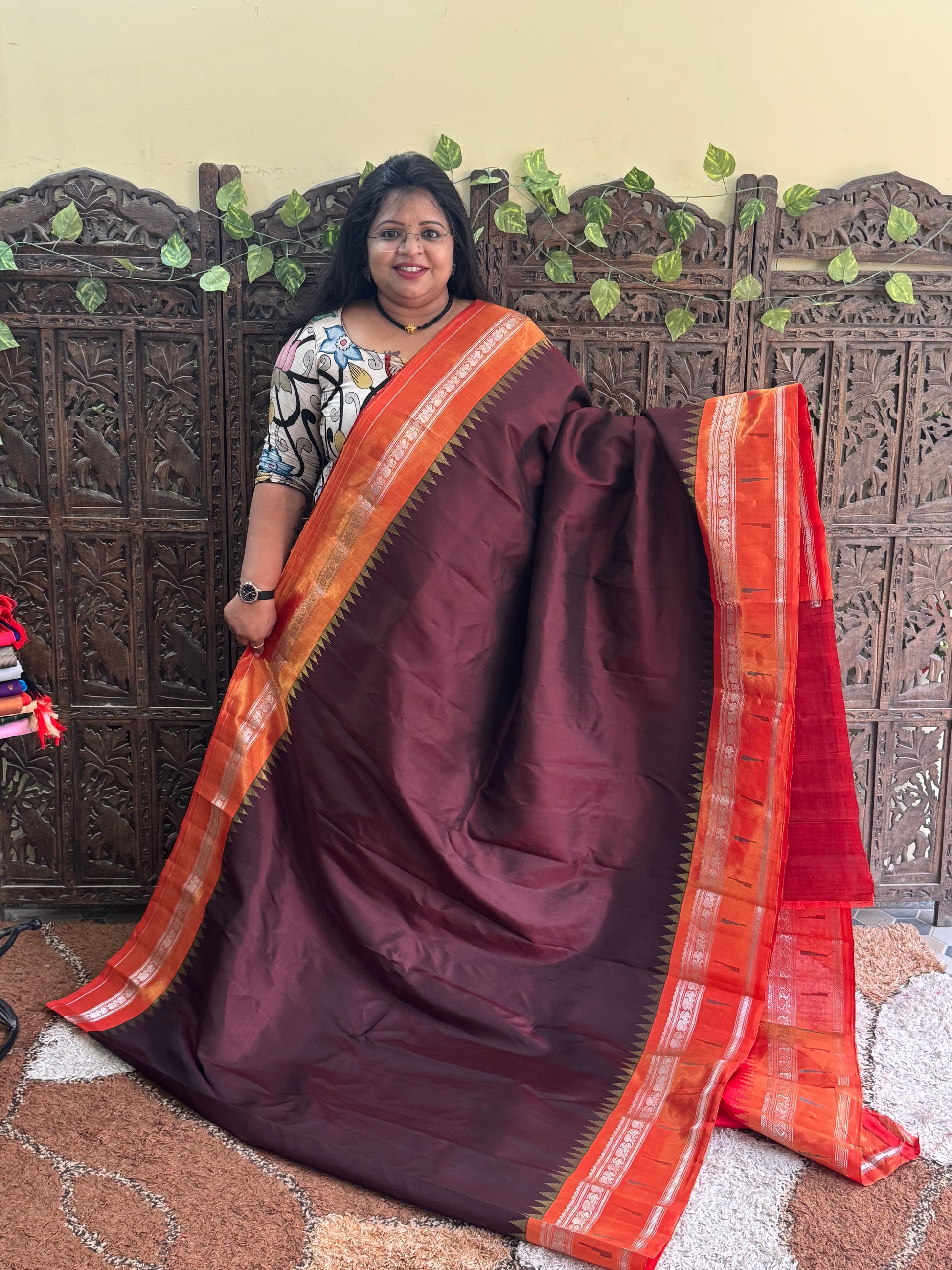 Brown Gadwal Silk Saree with Gold Zari Border — Pure Handloom | Silk Mark Certified