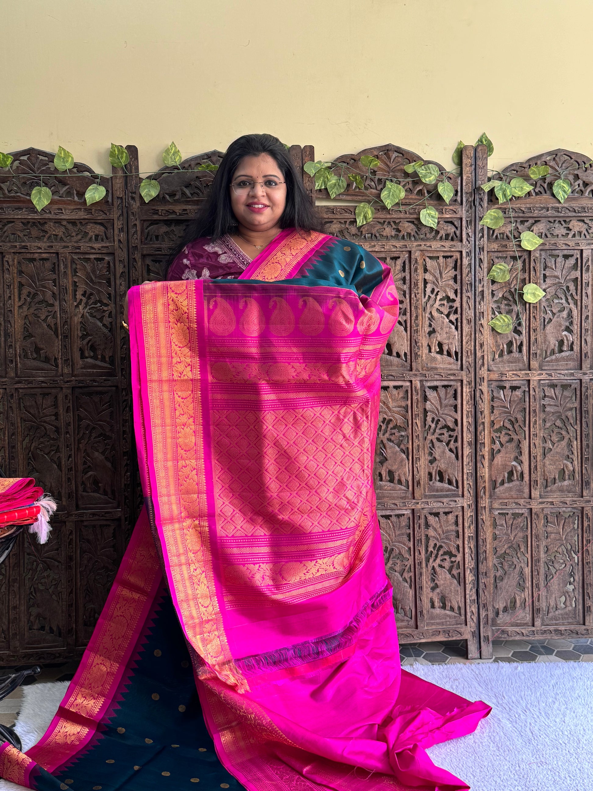 Gadwal Silk Saree Dark Teal Blue Colored Complemented With Gold Zari Border