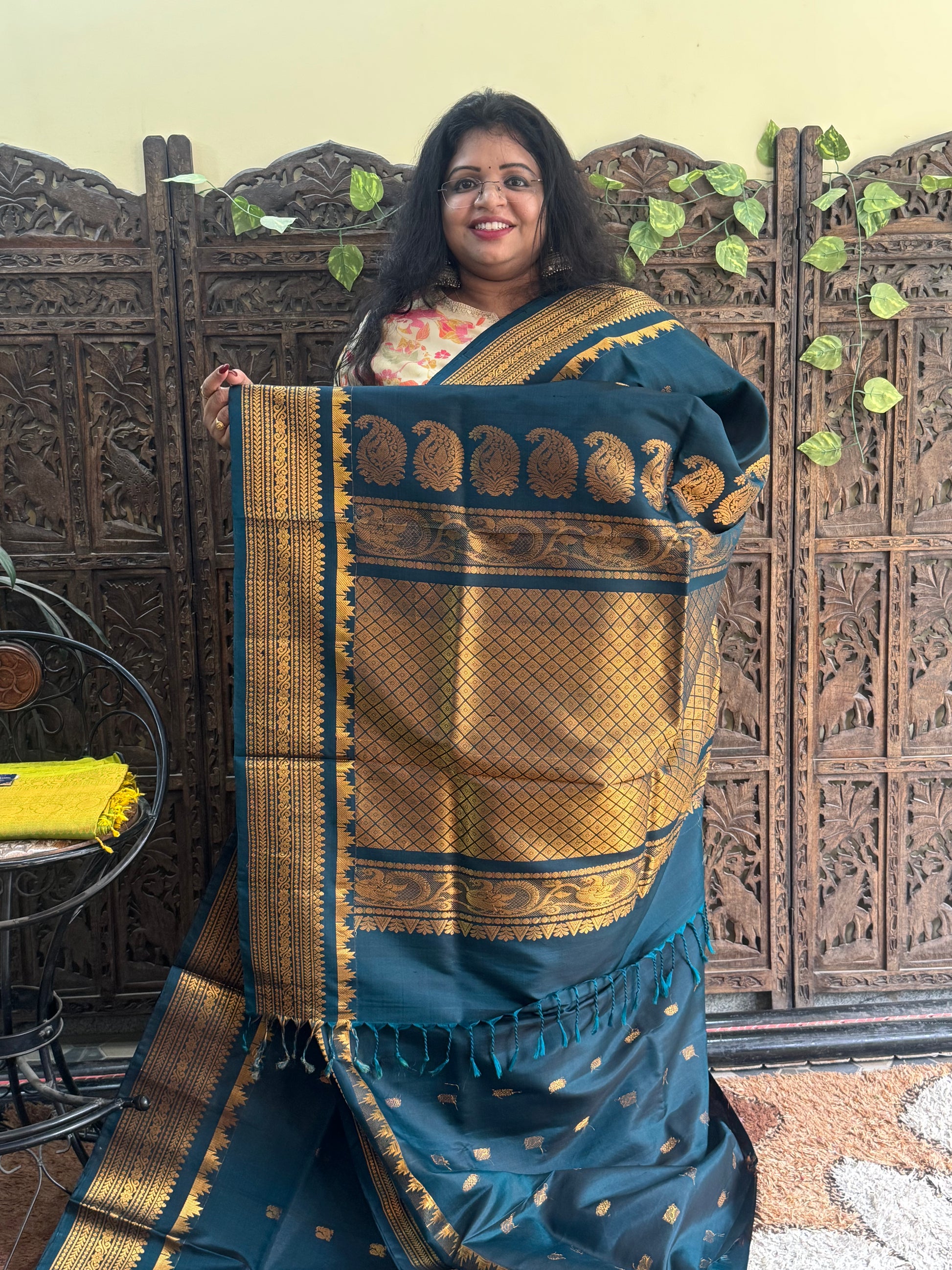 Gadwal Silk Saree teal Blue Colored Complemented With Gold Zari Border