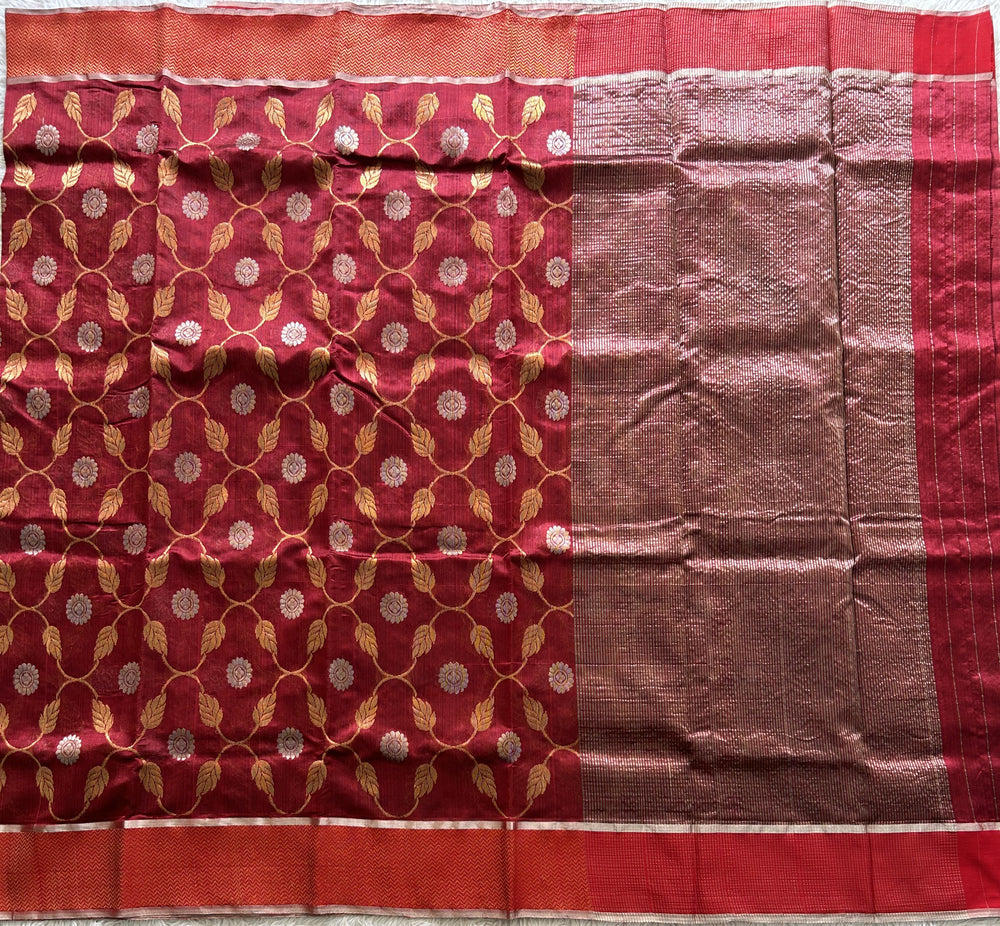 Maroon Chanderi Silk Saree With Gold Zari Border — Pure Handloom | Silk Mark Certified