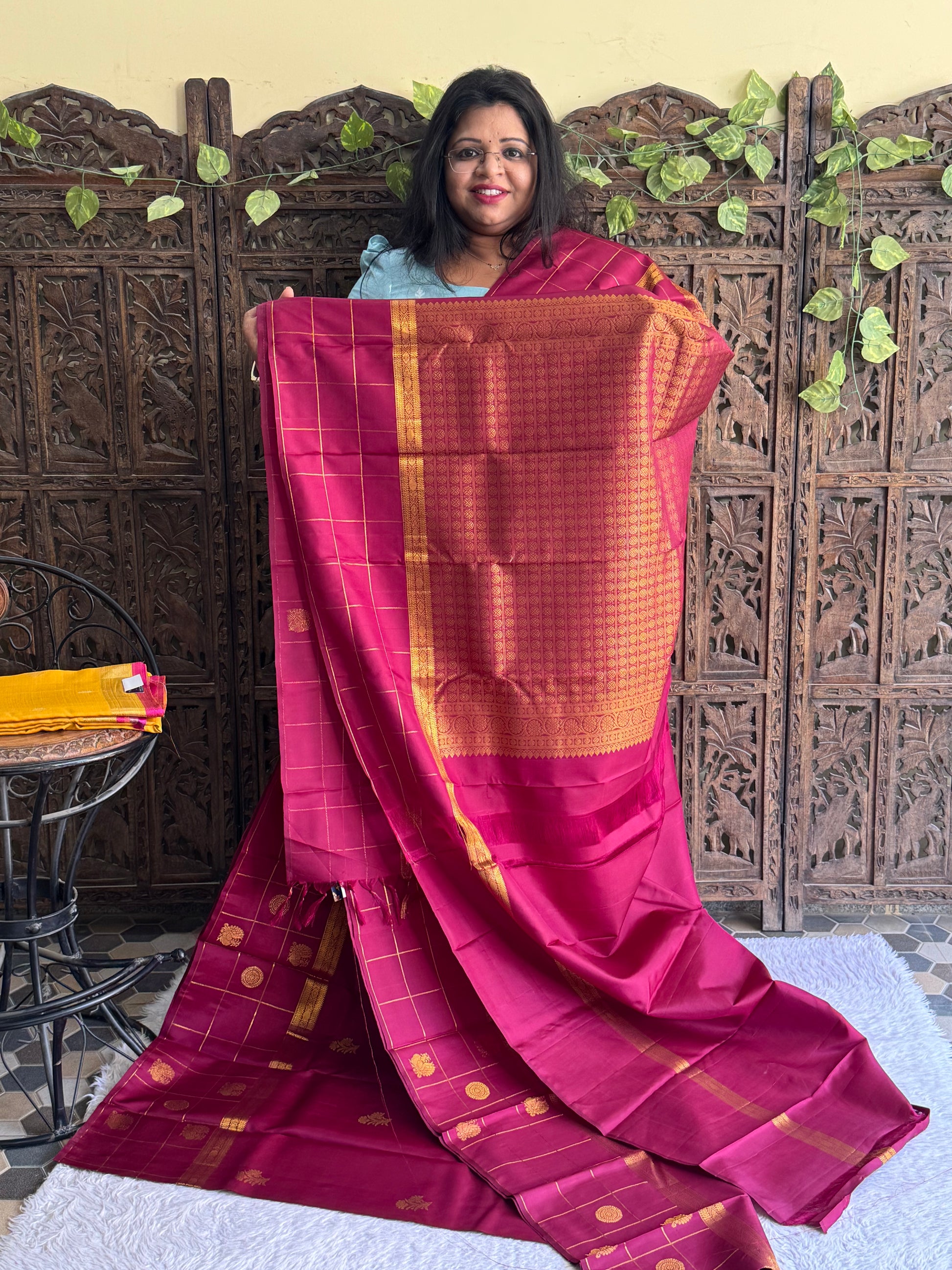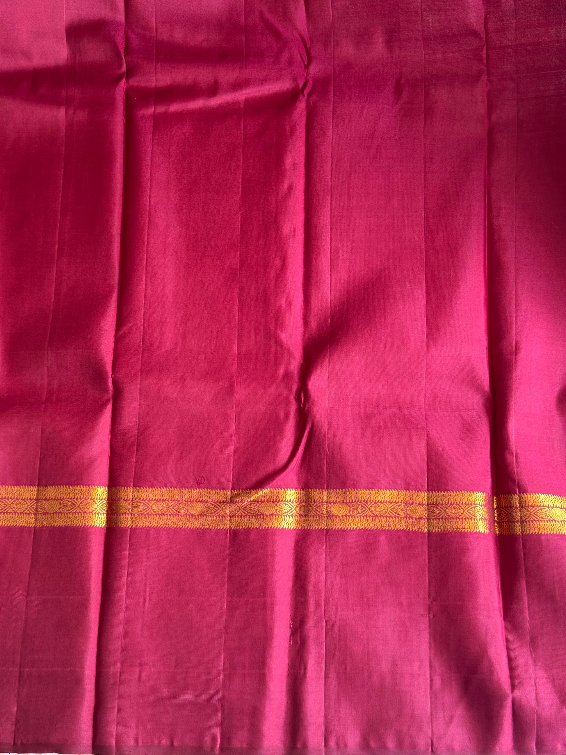 Pure Kanjivaram Silk Saree Light Wain Colored Elegantly Paid with a Gold Zari Border.