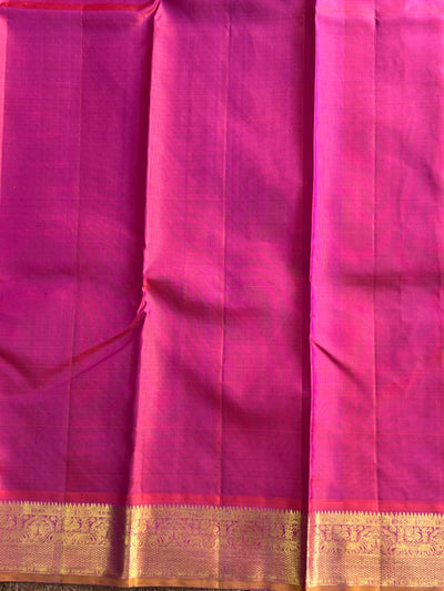 Zari and Contrast border crafted in Gold Zari, featuring Temple (Gopuram / Rekku) Pattern, Elephant (Gaja / Hasti) Butta and Peacock (Mayil / Mor) Butta.