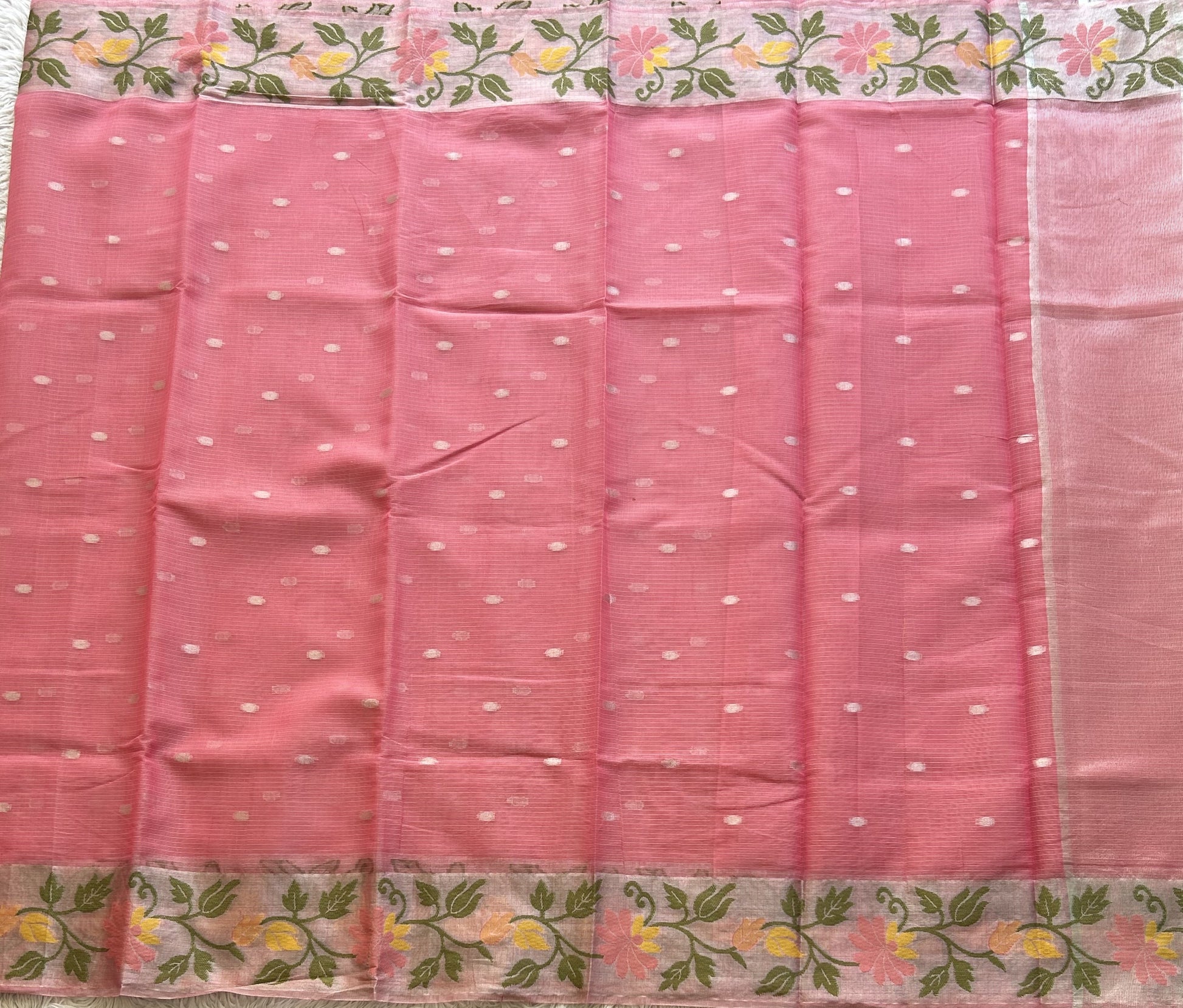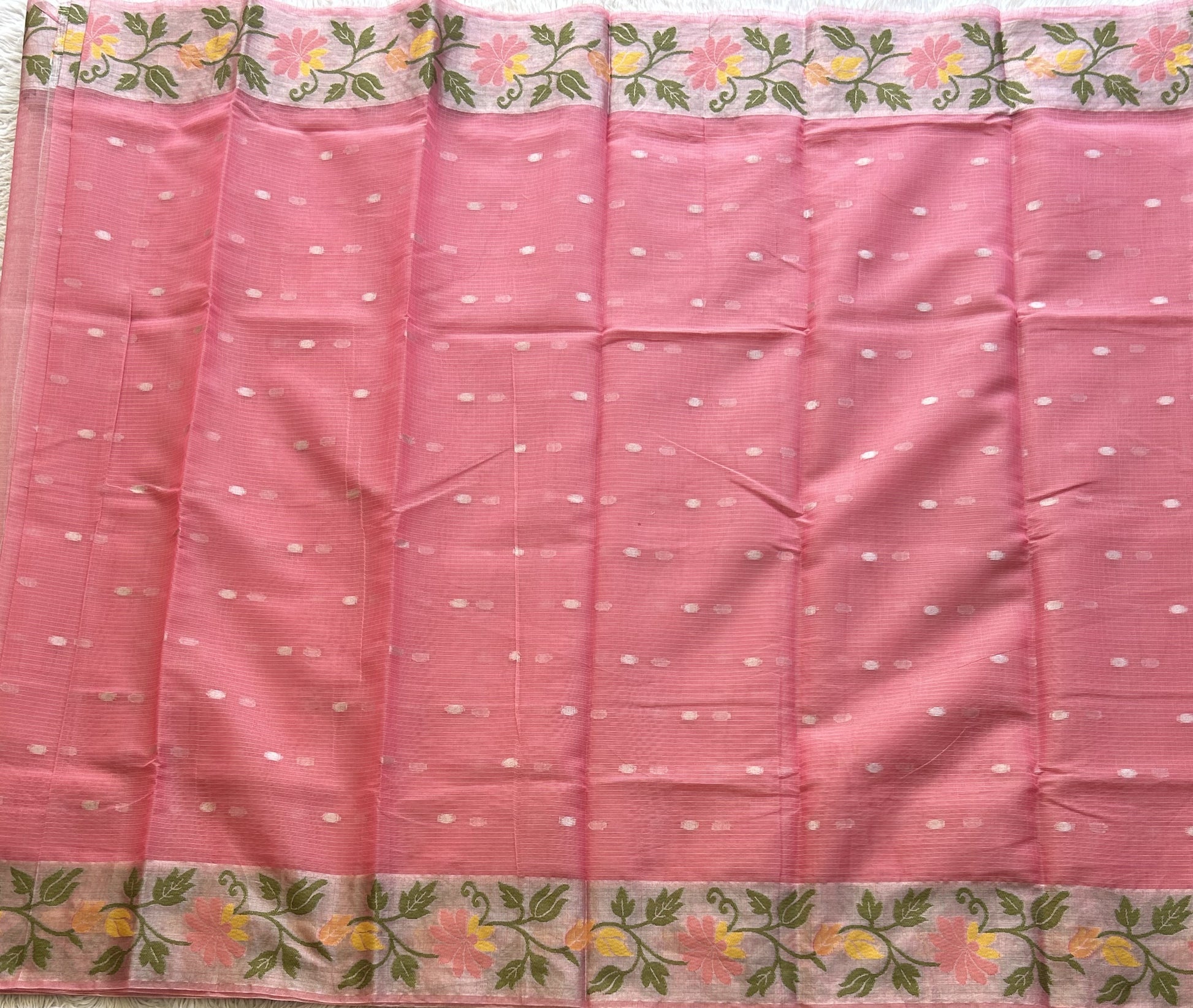 Silk Kota Saree Light Hot Pink Colored Elegantly Paired with a Tissue Border